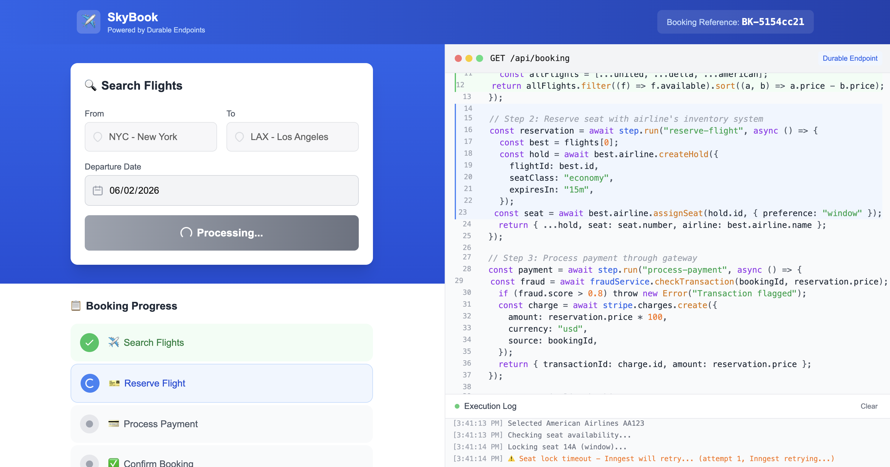 The Trip Booker example is a complete Next.js app that demonstrates all of these patterns with a real UI, progress tracking, and intentional failures to show retry behavior in action.
